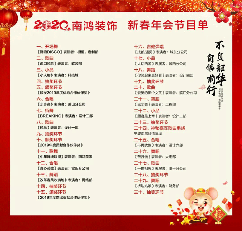 1月16日,主題為“不負韶華,自信前行”的南鴻裝飾2019年度表彰大會暨文藝晚會在杭州杭州寶盛道谷酒店隆重舉行。