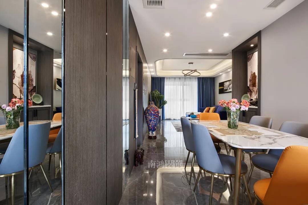 空間內(nèi)的輕奢精致與現(xiàn)代的簡(jiǎn)約美感結(jié)合得恰到好處,吊頂一路鋪展至餐廳,南北連貫性極好。