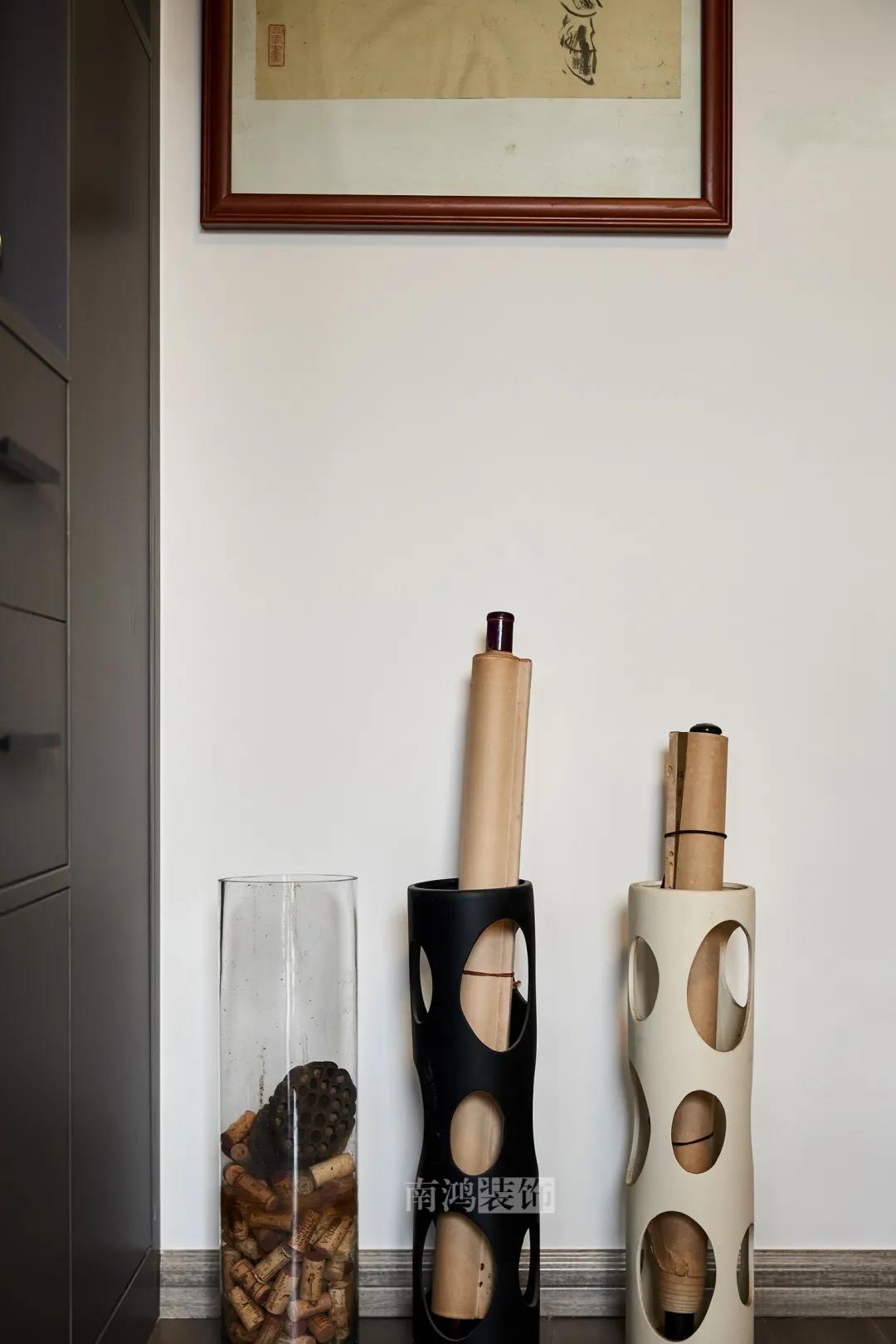 格調(diào)滿滿的書(shū)房空間,布置精簡(jiǎn)但非常有儀式感,一側(cè)是深色置物柜,提供充足的空間收納書(shū)籍與各種藝術(shù)擺件。