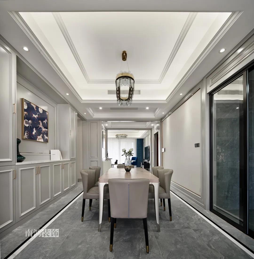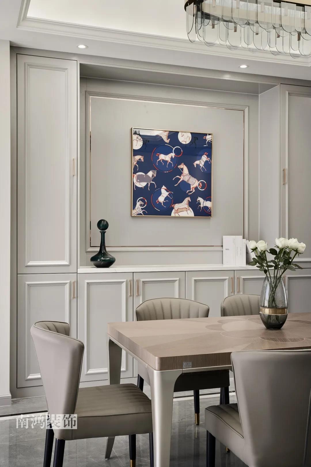 本案在硬裝上采用全屋護(hù)墻板,組合上不銹鋼線條,呈現(xiàn)非常有質(zhì)感有層次的輕奢細(xì)節(jié)。張弛有度的設(shè)計(jì)處理,強(qiáng)化了對(duì)空間框架和秩序的知覺,為屋主營(yíng)造出頗具儀式感的生活氛圍。