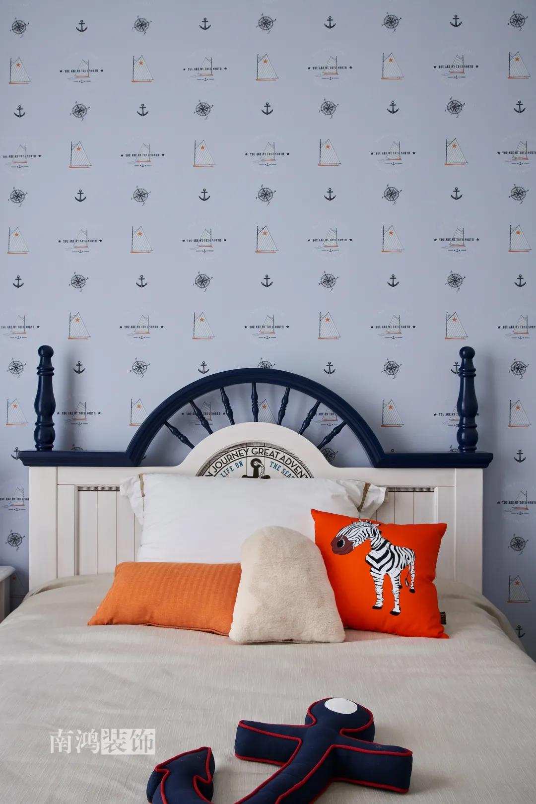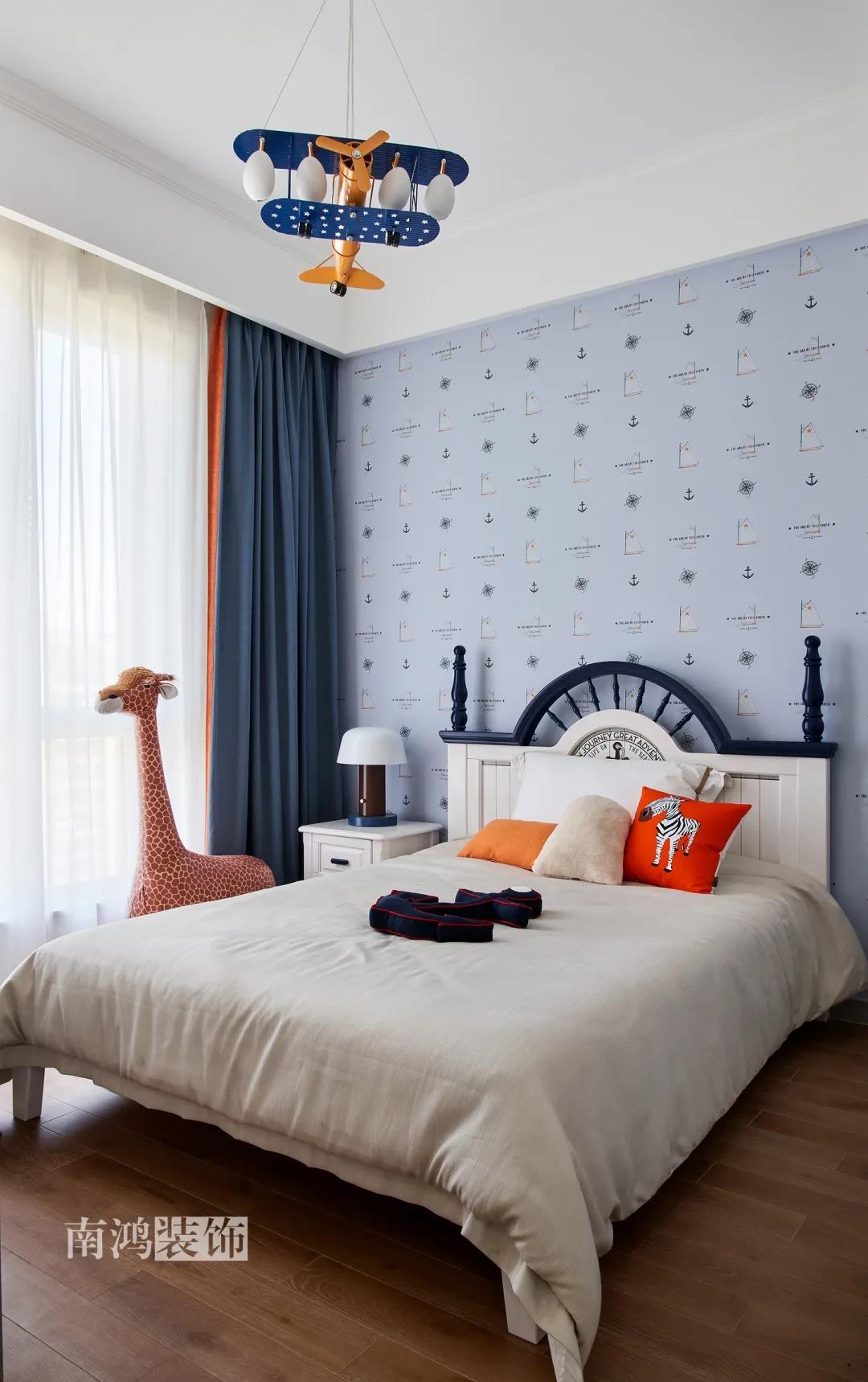 兒童房主打男孩喜愛的藍(lán)色系,飛機(jī)樣式的吊燈與長(zhǎng)頸鹿玩偶充滿著浪漫的想象,將活潑的童趣與審美融合得恰到好處。