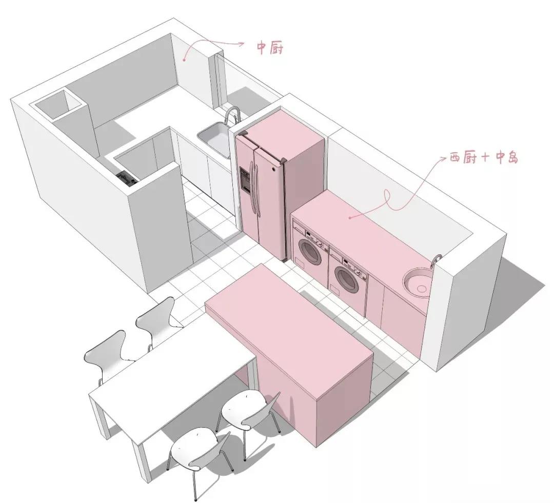 如果你是那種西餐或烘焙的愛好者,想要有更多的操作空間,或者廚房用品特別多而餐廚空間又有盈余的話,不妨再多添入一個中島臺