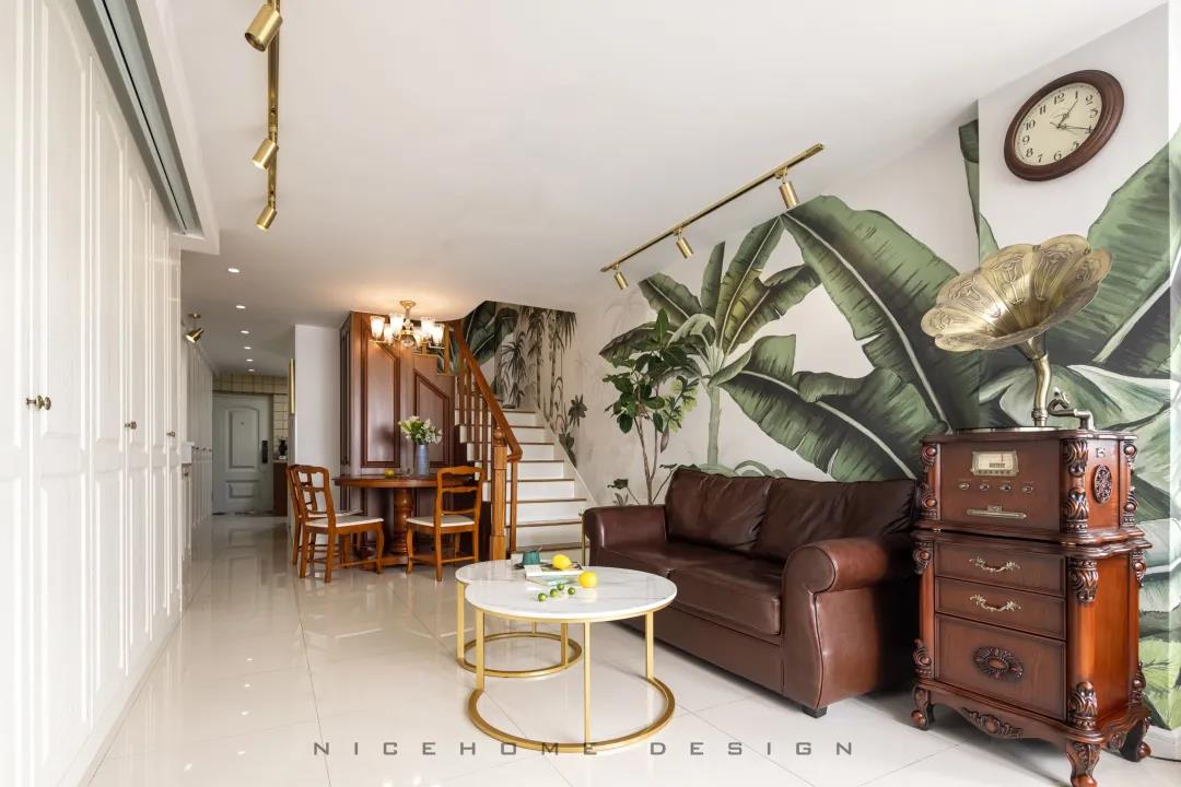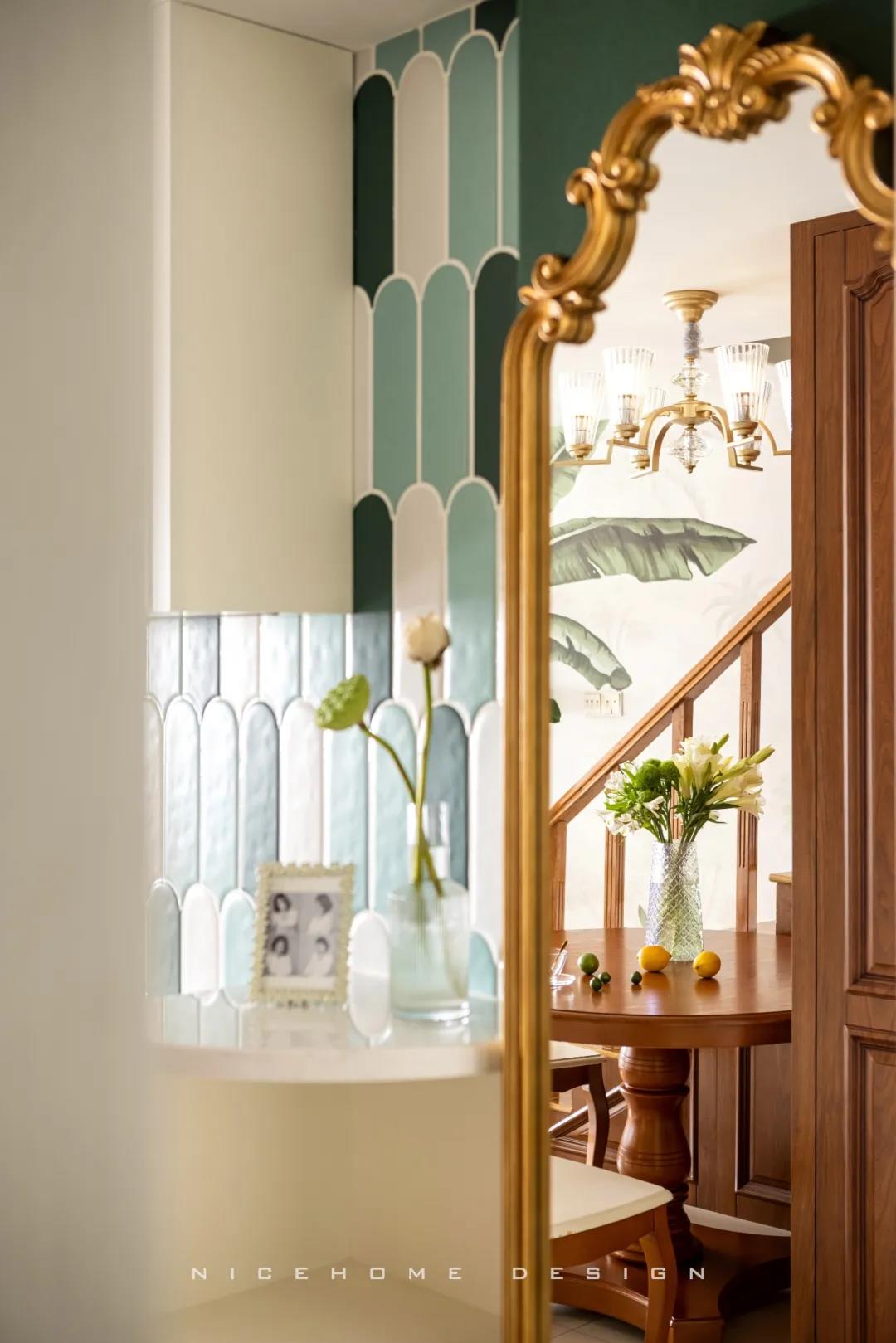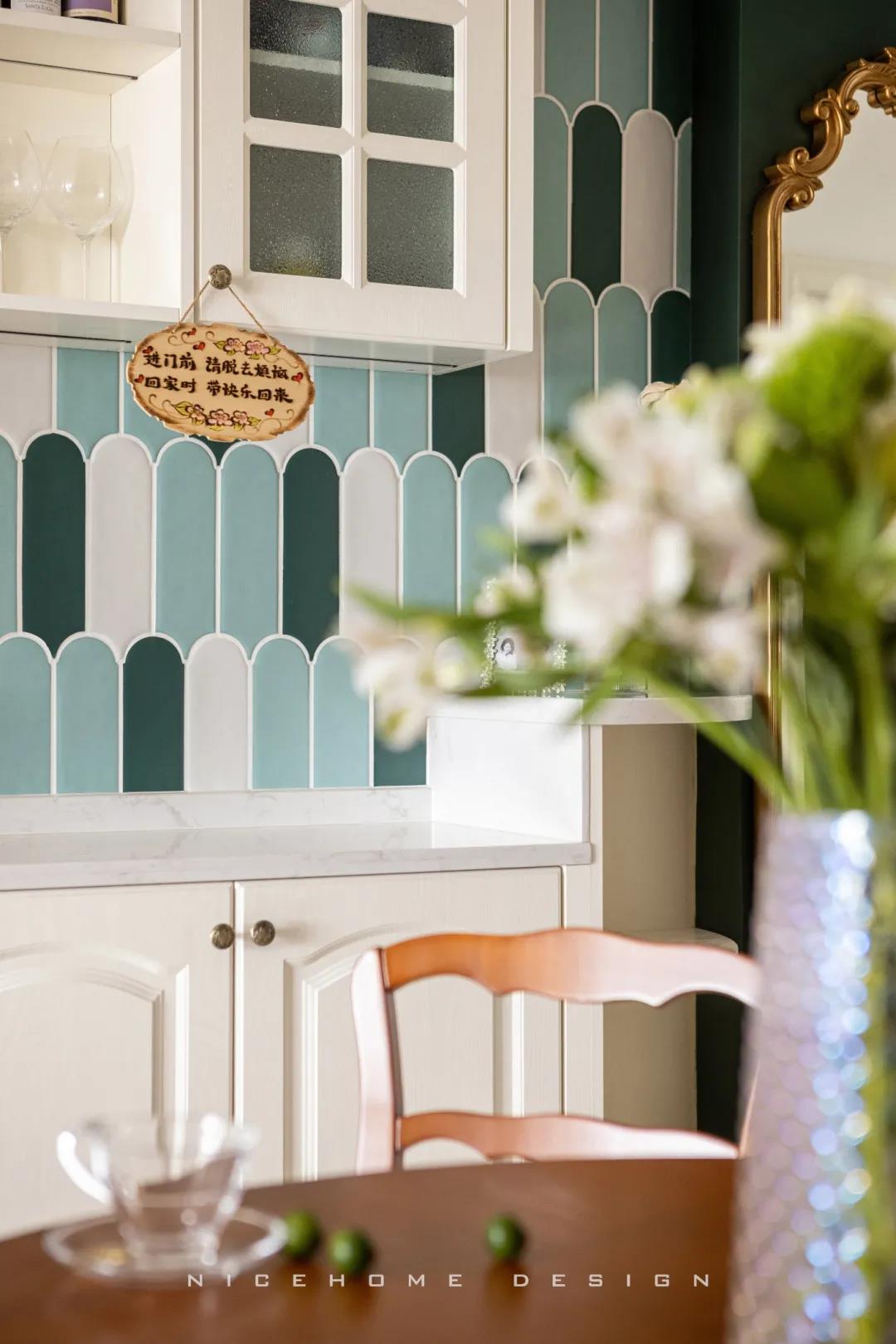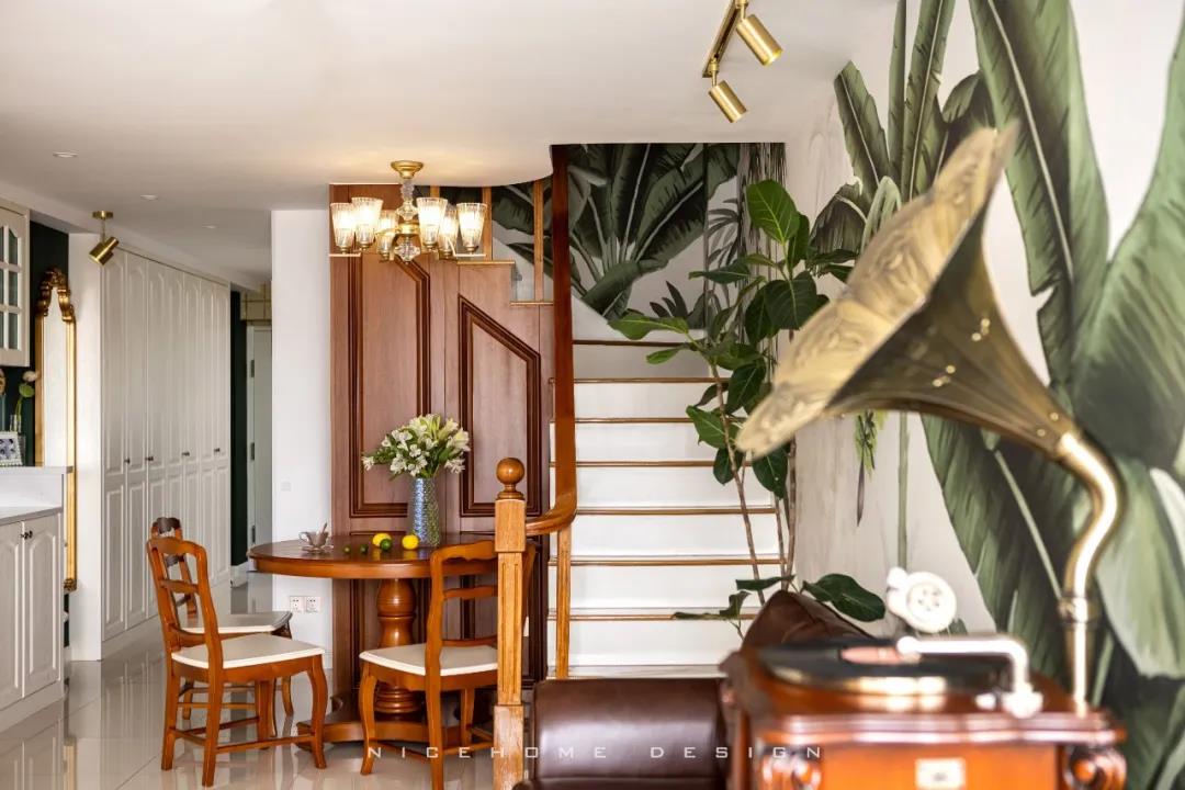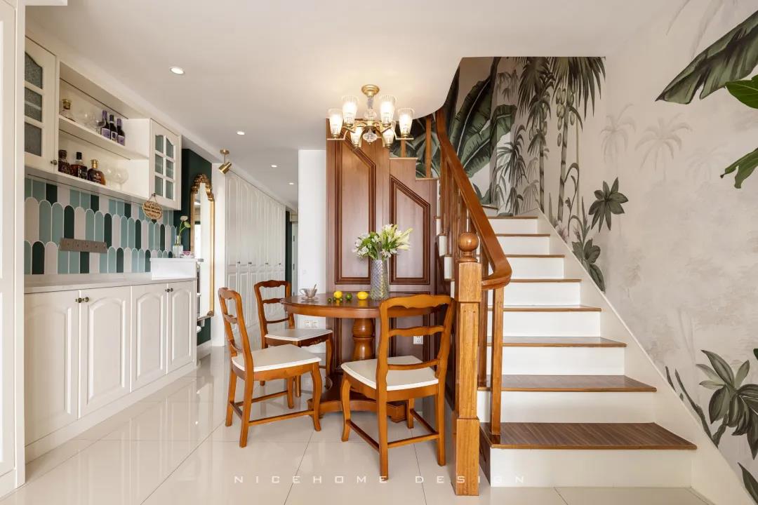 玄關(guān)3米長(zhǎng)的鞋柜區(qū)延伸進(jìn)來(lái)至樓梯下的餐廳空間,餐邊柜長(zhǎng)約2米3,墻面鋪貼彩色孔雀羽瓷磚,清新又顯活力。棕櫚樹(shù)背景一路鋪展上樓梯,成為本案一大亮點(diǎn)。