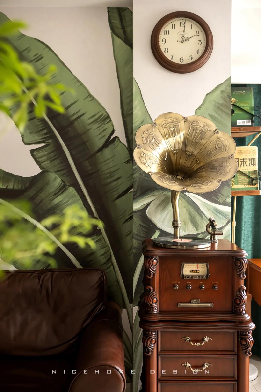 客廳,簡(jiǎn)潔的陳設(shè)釋放出日常生活所需的空間感,復(fù)古綠的棕櫚樹(shù)定制墻畫(huà)和深棕色系家具形成強(qiáng)烈對(duì)比,消弭藝術(shù)與生活的邊界,墻角的留聲機(jī)成為點(diǎn)睛之筆。