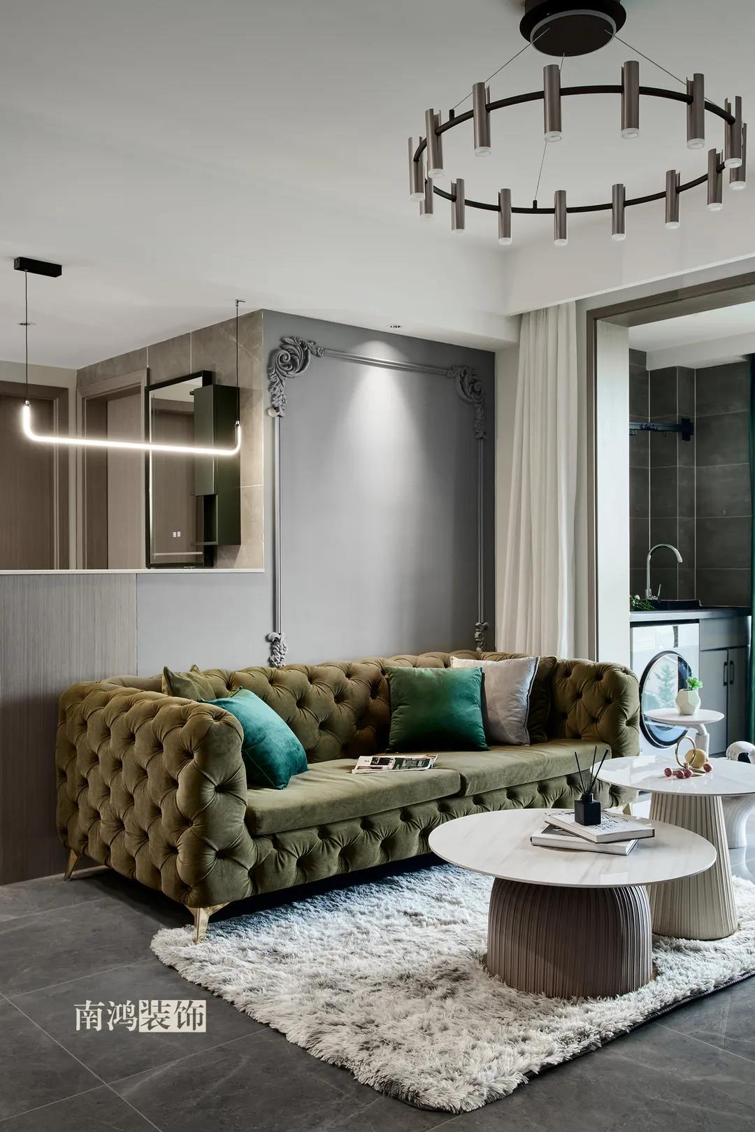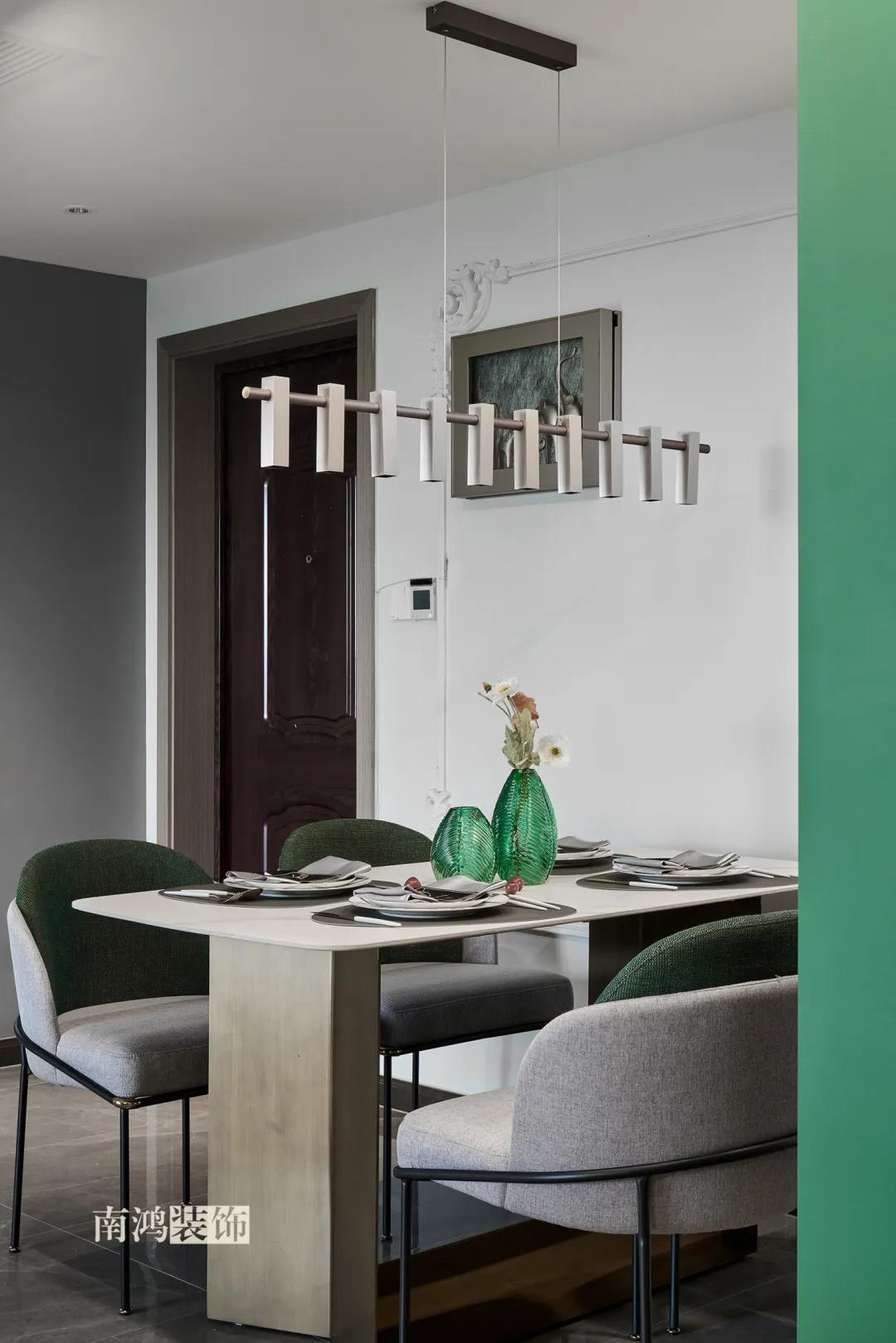 客餐廳一體式設計是小戶型的常見選擇,也更符合現代人的生活習慣。灰白主色保持整體低調,局部墻面以飽和度高的綠色乳膠漆涂刷,空間被提亮不少。