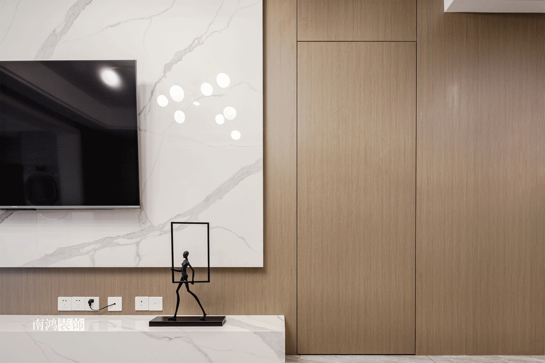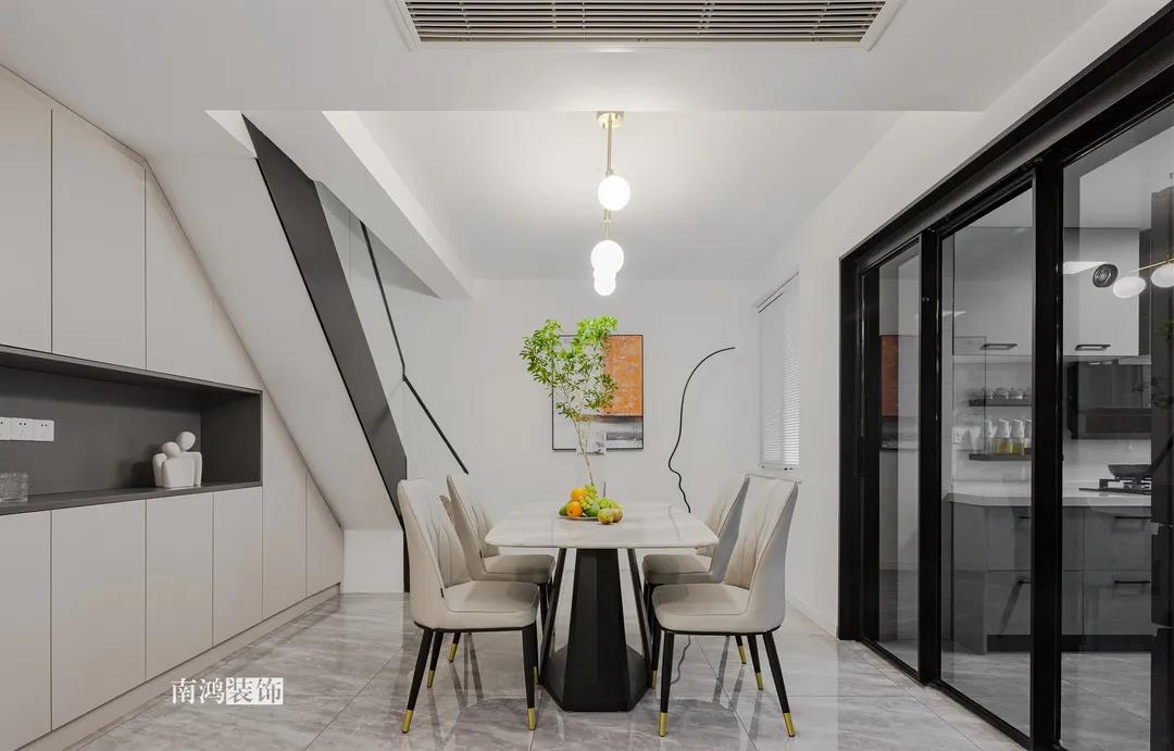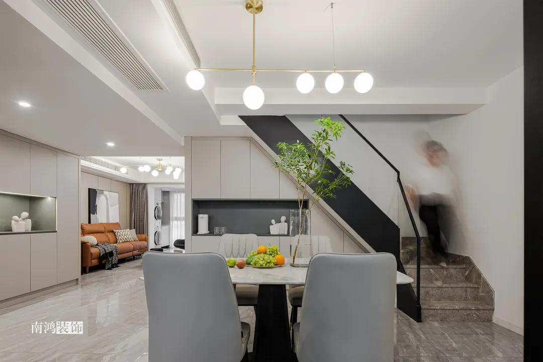 本案是一套現(xiàn)代輕奢風格的復式作品,業(yè)主夫妻二人,暫無小孩子,房間上除主臥之外,保留了兩個次臥做父母房和兒童房,一樓寬敞通透的開放式公區(qū)域設計成為本案一大亮點。 一層集合了日常所有的的煙火氣,蒸箱、烤箱、咖啡機、洗碗機、洗衣機...攜帶著一種隨性的自由,廚房到客廳依次構(gòu)成白與黑、疏與密、放與收的過渡對比,層次感的疊加形成舒適的視覺體驗。 空間以暖調(diào)的木飾面色搭配黑白灰作為整體基調(diào),簡約利落又不失家的溫馨。 戶型分析 ▼ 原始戶型存在一樓空間相對擁擠,樓梯陡峭,走起來費力,二樓空間利用率不高等問題。 1、樓梯位置調(diào)整,打造多個收納展示空間。 2、原有結(jié)構(gòu)陽臺納入室內(nèi),擴大客廳使用面積和直接采光面。 3、廚房門洞改變方向,消除了原廚房與客餐廳的隔閡,打造一體化、全開放的格 局。 入戶區(qū)迎面而來一層開放大格局,往左為客廳,視野通透舒暢。定制儲物柜滿足基本的收納需求,色彩由淺入深,層次清晰分明,滿足功能的同時不失視覺美感。 青草綠點綴出小清新,柜內(nèi)設計隱藏式燈帶,見光不見燈的效果,簡單一筆勾勒出空間輪廓與光影質(zhì)感。 客 廳 LIVING ROOM 美觀大方的客廳空間,左右兩側(cè)維系著剛剛好的距離,溫和的底色在視覺上減輕了壓迫感。大理石與木飾面結(jié)合的電視背景,搭配硬包,皮藝沙發(fā)和單椅,顯出輕奢意味。 黑白灰三色搭配的餐廳空間,點綴的金屬材質(zhì)點亮活力。開敞明亮的用餐環(huán)境,兩側(cè)都留有足夠大的通道距離,應對日常的社交聚餐可以說毫無壓力。 空間的時尚高級感,除了整體硬裝、家具的造型選擇之外,更重要在于細節(jié)的雕琢。由樓梯下來的白凈墻面,除了懸掛常規(guī)的裝飾畫外,由黑色線條勾勒的人像圖形也頗有趣味,讓人能感受到一種自在而愉悅的氛圍。 灰色向來是現(xiàn)代感家居的寵兒,沉靜色彩更能凸顯質(zhì)感。 廚 房 KITCHEN 廚房與餐廳以玻璃門相隔,保持視覺的通暢,U型設計極大地提高空間利用率,洗菜、切菜、烹炒動線流暢,高效下廚輕輕松松。 主臥包入陽臺打造為休閑區(qū),床頭背景清新的淺藍色與床品的灰色、單椅的橙色形成了具有層次感的溫馨格調(diào)。 床尾打造女主人的梳妝臺,豎線條裝飾營造縱橫維度的立體感,與留白的墻面相映襯,豐富了主臥空間的現(xiàn)代意象。 休閑陽臺除了一把單椅外,還有造型輕巧的穿衣鏡與掛衣架,生活的小確幸就在一點一滴的細節(jié)間把握。 長輩房藏在客廳隱形門背后,不增添過多修飾的空間更加簡約耐看,偶爾來小住的父母也有了私密的休憩之地。 長虹玻璃門引入外部光線,保證衛(wèi)浴室的明凈感受。壁掛馬桶不留衛(wèi)生死角,方便日常清潔。黑色的五金件隱隱占據(jù)視覺主導,將利落的現(xiàn)代感盡可能放大。