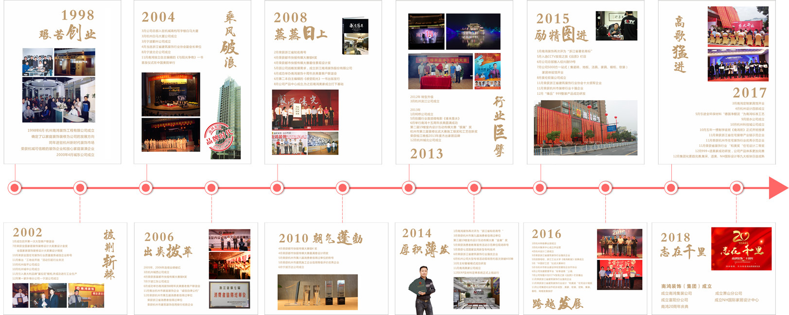 浙江南鴻裝飾股份有限公司成立于1998年,前身為杭州南鴻裝飾工程有限公司,為浙江省著名商標(biāo)、知名商號企業(yè)。南鴻已發(fā)展成為一個擁有31個直屬裝飾分公司和集產(chǎn)品、櫥柜、軟裝、定制、空暖、集采六大板塊的大型裝飾企業(yè),裝修業(yè)務(wù)遍及浙江省內(nèi)外??倶I(yè)務(wù)體量到已經(jīng)達到8個億,歷年來,公司獲得了全國、浙江省、杭州市等授予的近百項榮譽。南鴻人始終秉承“做裝修,交朋友”的核心思想,正直、謙遜、寬容、樂觀、堅持的經(jīng)營服務(wù)理念,為廣大客戶打造高品質(zhì)家居生活而努力,在十多年的家裝浪潮中實現(xiàn)了管理和產(chǎn)品雙升級,并成為浙江省管理型的家裝企業(yè)中的翹楚。樹有根,水有源,所以感恩時代,奉獻社會,將是南鴻的一貫品格和永遠的追求。